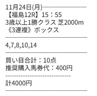 馬券代も総額4000円で出しやすい!それで三連複的中でしっかり利益が出る。